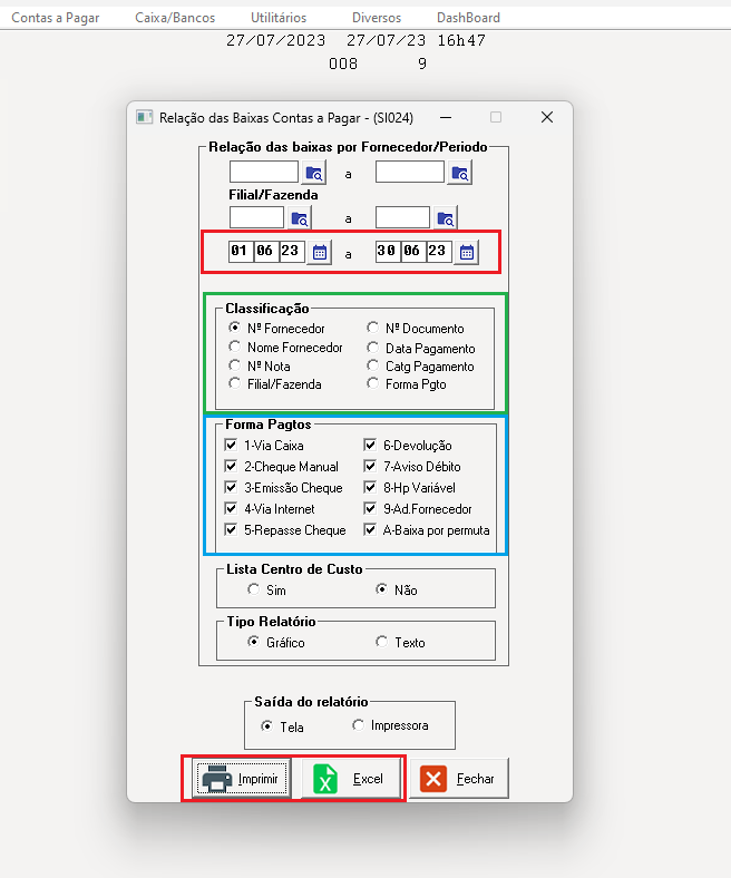Na opção Classificação você seleciona qual será a ordem, como no print esta para sair por fornecedor, mas pode-se gerar o relatório da maneira que for mais conveniente, na Forma Pagtos terão todas as formas de pagamento que podem ser pagas no sistema, e que, se necessário que saiam todos os tipos, basta deixar todos selecionados. Por fim vai a critério do usuário em gerar o relatório em tela/impressora ou Excel.